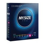 3 condoms of natural rubber latex, cylindrically shaped, transparent, plain, lubricated, with reservoir tip. Nominal width: 64 mm Particularly low in allergens thanks to the use of extremely pure VYTEX latex. This contains over 90% less latex proteins and is practically free of allergy-causing proteins and impurities. Strong reduction of the otherwise usual condom smell through the use of VYTEX latex. MY.SIZE PRO condoms have a minimum wall thickness of 0.05 up to 0.06 mm particularly thin and therefore particularly sensitive. During the production and manufacture of MY.SIZE PRO only products used that are free from animal ingredients and not in animal experiments were tested. Condoms made from natural rubber latex should not be used by people who are allergic to latex or whose skin is sensitive to latex. They are best stored in a cool, dry place, away from heat and direct sunlight. They should not be used after the date indicated on the packaging or sealing foil. No contraceptive offers 100% protection against sexually transmitted diseases or pregnancy. Used condoms belong in the trash, not in the toilet or in the environment. If you want to use lubricant, make sure it is suitable for use with condoms. Notes: Read the instructions for use. Contains latex. Do not expose to direct sunlight. Do not use if the packaging is damaged. Protect from moisture. For single use only.