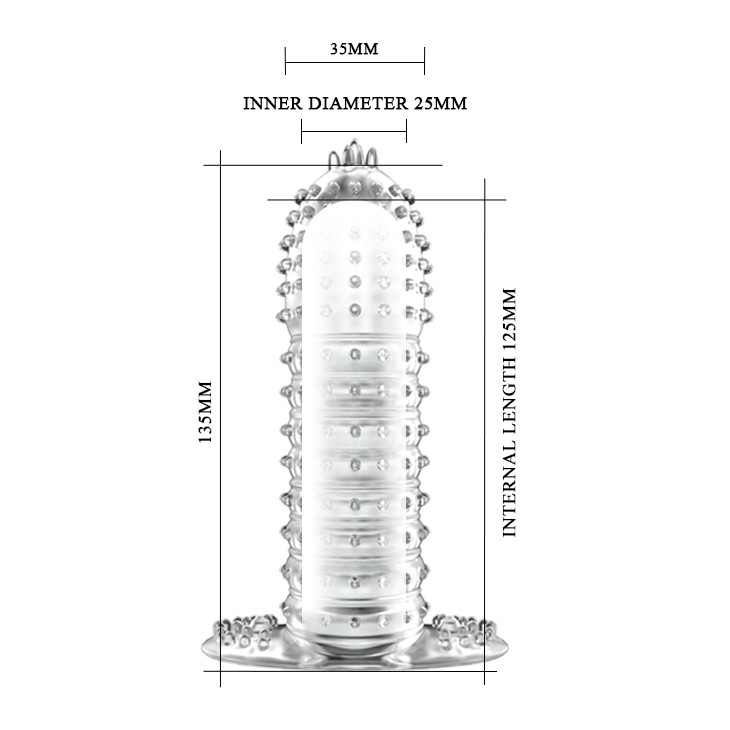 სილიკონისგან დამზადებული მრავალჯერადი პრეზერვატივი ტექსტურირებული ზედაპირით. რეკომენდაცია: სათამაშოს სიცოცხლისუნარიანობის შესანარჩუნებლად გამოიყენეთ მხოლოდ წყლის ბაზაზე დამზადებული ლუბრიკანტები. გამოყენების შემდეგ გარეცხეთ თბილი წყლითა და თხევადი საპნით ან გამოიყენეთ სპეციალური ანტისეპტიკური სპრეი. მთლიანი სიგრძე: 13.5 სმ, დიამეტრი: 3.5 სმ.