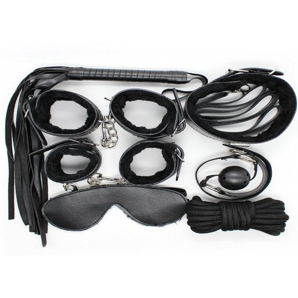 შავი ფერის BDSM ნაკრები – კომპლექტშია: • 4 ცალი ბორკილი (2 ხელის, 2 ფეხის). • რეგულირებადი ჩოქერი და საბელი, რომელიც მაგრდება ჩოქერზე. • BDSM თოკი. • მათრახი. • პირის ბურთულა (ე.წ. Ball Gag). • ეროტიული თვალის ნიღაბი.