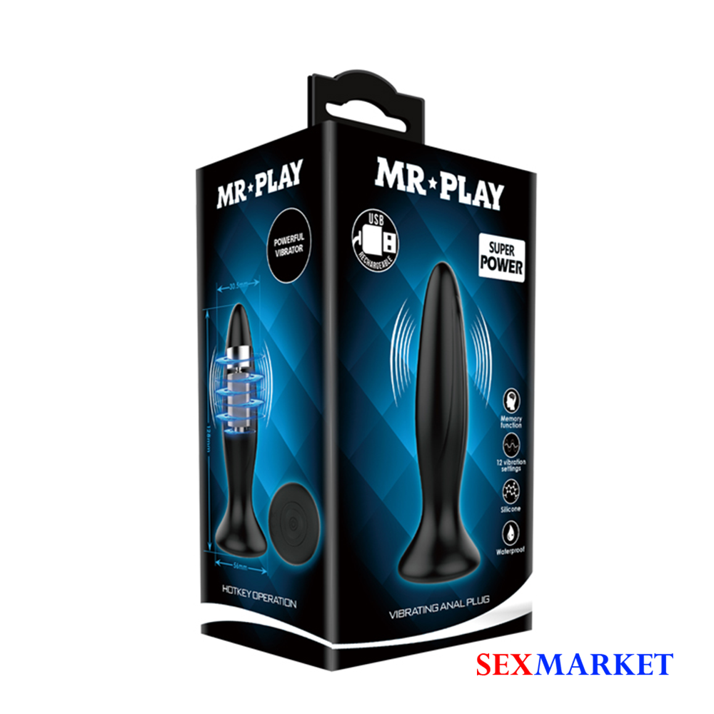MR*PLAY – წყალგაუმტარი ანალური საცობი ვიბრაციით. აქვს 12 რეჟიმი, რაც საშუალებას მოგცემთ ღილაკზე დაჭერით დაარეგულიროთ თქვენთვის სასურველი ვიბრაციის ინტენსივობა.. მოყვება USB დამტენი. მთლიანი სიგრძე: 12.8 სმ, დიამეტრი: 3.5 სმ.