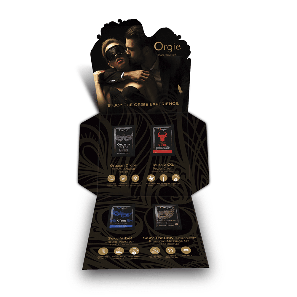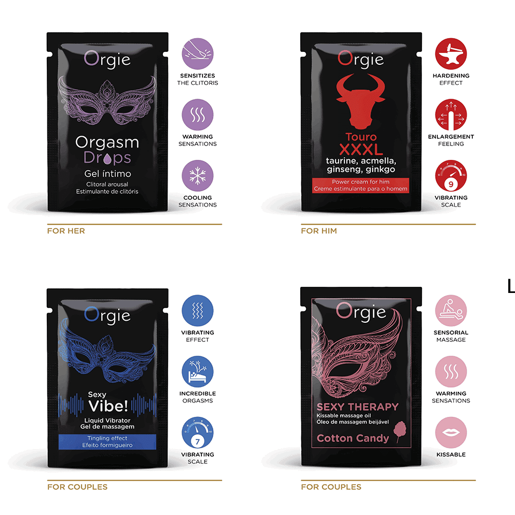 ORGIE The Play Set – არის 4 ბესტსელერი პროდუქტის იდეალური კომბინაცია, რომელიც წარმოდგენილია 2 მლ-იან მოსახერხებელ პაკეტებში (საშეტებში). ეს ნაკრები საუკეთესო არჩევანია: რომანტიკული მოგზაურობისთვის ან დასვენებისთვის; ორიგინალური პატარა საჩუქრისთვის; ან Orgie-ს პროდუქტების შესამოწმებლად და გასაცნობად. ნაკრები მოიცავს 4 პოპულარულ პროდუქტს: Orgasm Drops (ორგაზმის წვეთები), Touro XXXL (მამაკაცის სტიმულატორი), Sexy Vibe! Liquid Vibrator (თხევადი ვიბრატორი), Sexy Therapy kissable Massage Oil Cotton Candy (კოცნადი მასაჟის ზეთი “ბამბის ნაყინის” არომატით).