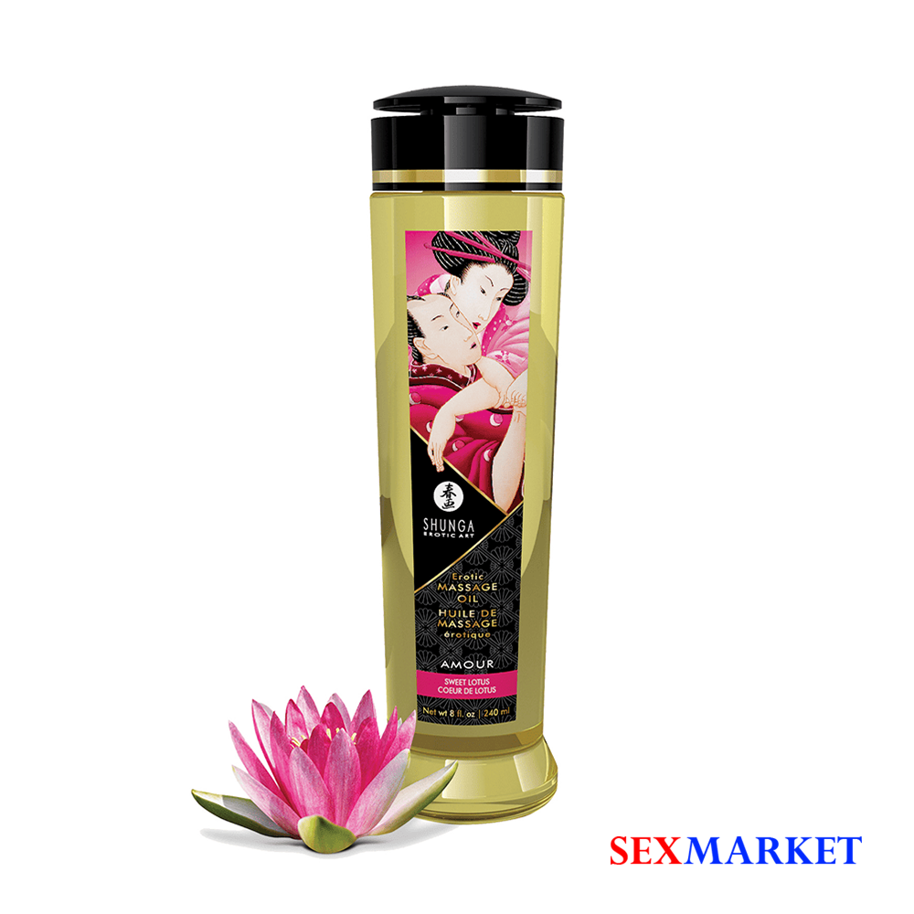 SHUNGA Massage Öl Amour (Sweet Lotus) – 100%-ით ნატურალური მასაჟის ზეთი ლოტუსის არომატით. შეიცავს ვიტამინ E-ს (ანტიოქსიდანტი). არ შეიცავს მინერალებსა და ცხოველურ ზეთებს.
