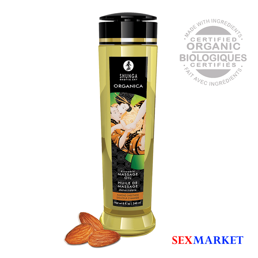 SHUNGA Massage Öl Aphrodisia (Organica Almond Sweetness) – 100%-ით ნატურალური მასაჟის ზეთი ეგზოტიკური ნუშის არომატით. შეიცავს ვიტამინ E-ს (ანტიოქსიდანტი). არ შეიცავს მინერალებსა და ცხოველურ ზეთებს.